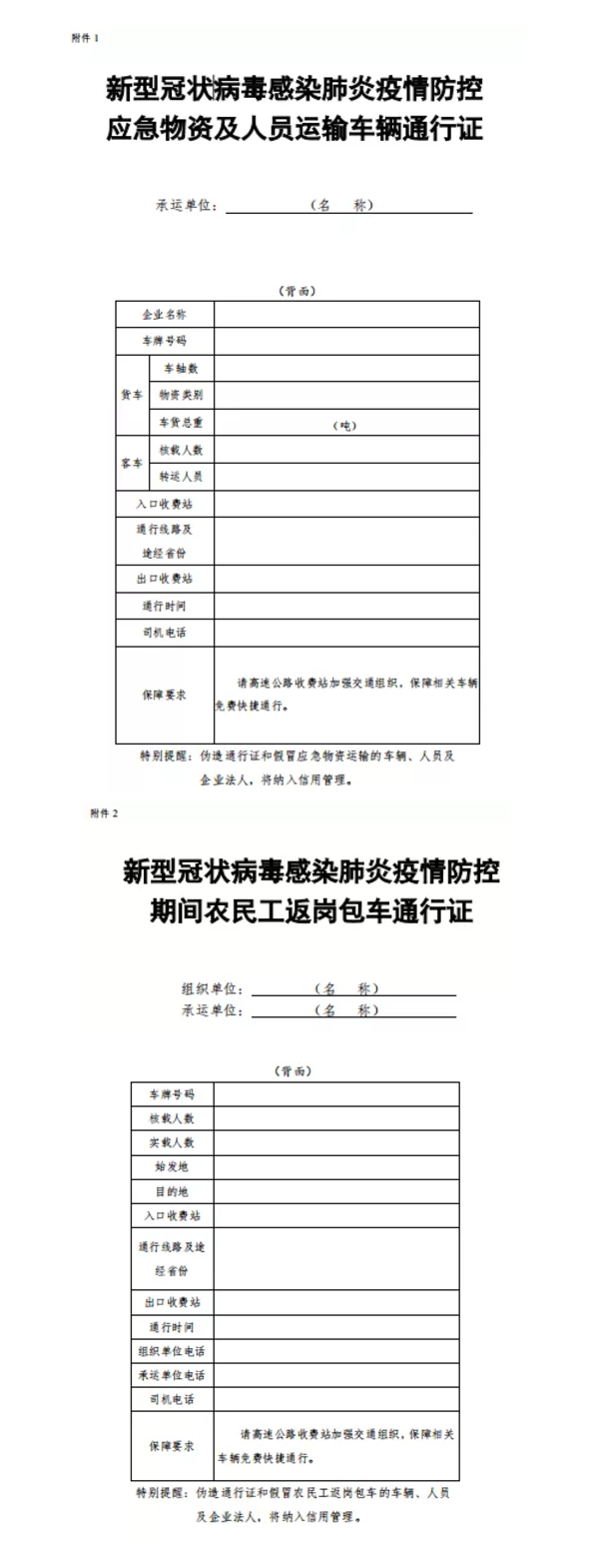 通知要求,地方各級交通運輸部門要認真落實《交通運輸部關(guān)于切實保障疫情防控應急物資運輸車輛順暢通行的緊急通知》和《交通運輸部關(guān)于疫情防控期間免收農(nóng)民工返崗包車公路通行費的通知》要求,切實簡化“新型冠狀病毒感染肺炎疫情防控應急物資及人員運輸車輛通行證”(簡稱“車輛通行證”)、“新型冠狀病毒感染肺炎疫情防控期間農(nóng)民工返崗包車通行證”(簡稱“包車通行證”)辦理流程,通過政府網(wǎng)站、微信、電子郵件等便捷方式提供“車輛通行證”“包車通行證”統(tǒng)一式樣,供承運單位或駕駛?cè)嗽诒镜刈孕写蛴?、自行填寫?/span>
