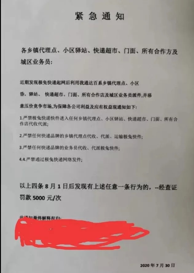 7月底,有某通達系快遞總部下發(fā)通知,要求全網(wǎng)各網(wǎng)點禁止代理極兔速遞業(yè)務,通知指出,攬派兩端加盟公司不得以任何理由、任何形式代理極兔速遞業(yè)務。還有通知指出,如果通達百系中鄉(xiāng)鎮(zhèn)代理點、小區(qū)、驛站、快遞超市等業(yè)務員因惡性低價競爭攬收極兔速遞的,經(jīng)查證,每次予以5000元罰款。