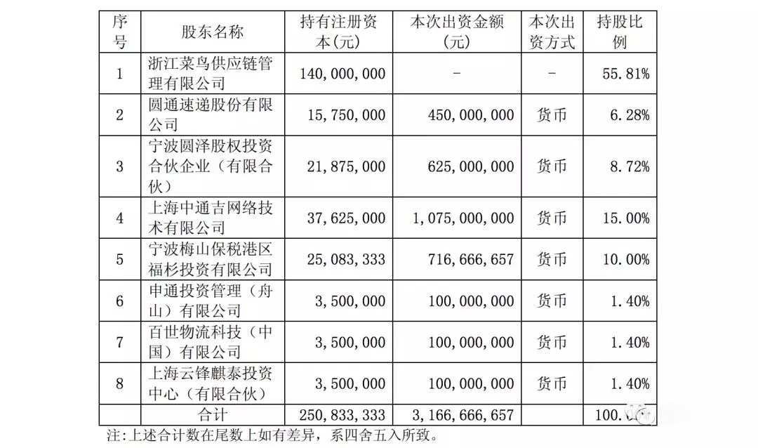 公告顯示,2018年第一季度,浙江驛??傎Y產(chǎn)6922萬(wàn)元,總負(fù)債7257.9萬(wàn)元,凈資產(chǎn)-335.9萬(wàn)元,營(yíng)業(yè)收入483.3萬(wàn)元,凈利潤(rùn)-1.14億元。本次增資前,浙江驛棧由浙江菜鳥(niǎo)供應(yīng)鏈100%控股,本次增資后浙江驛棧的股本結(jié)構(gòu)如下: