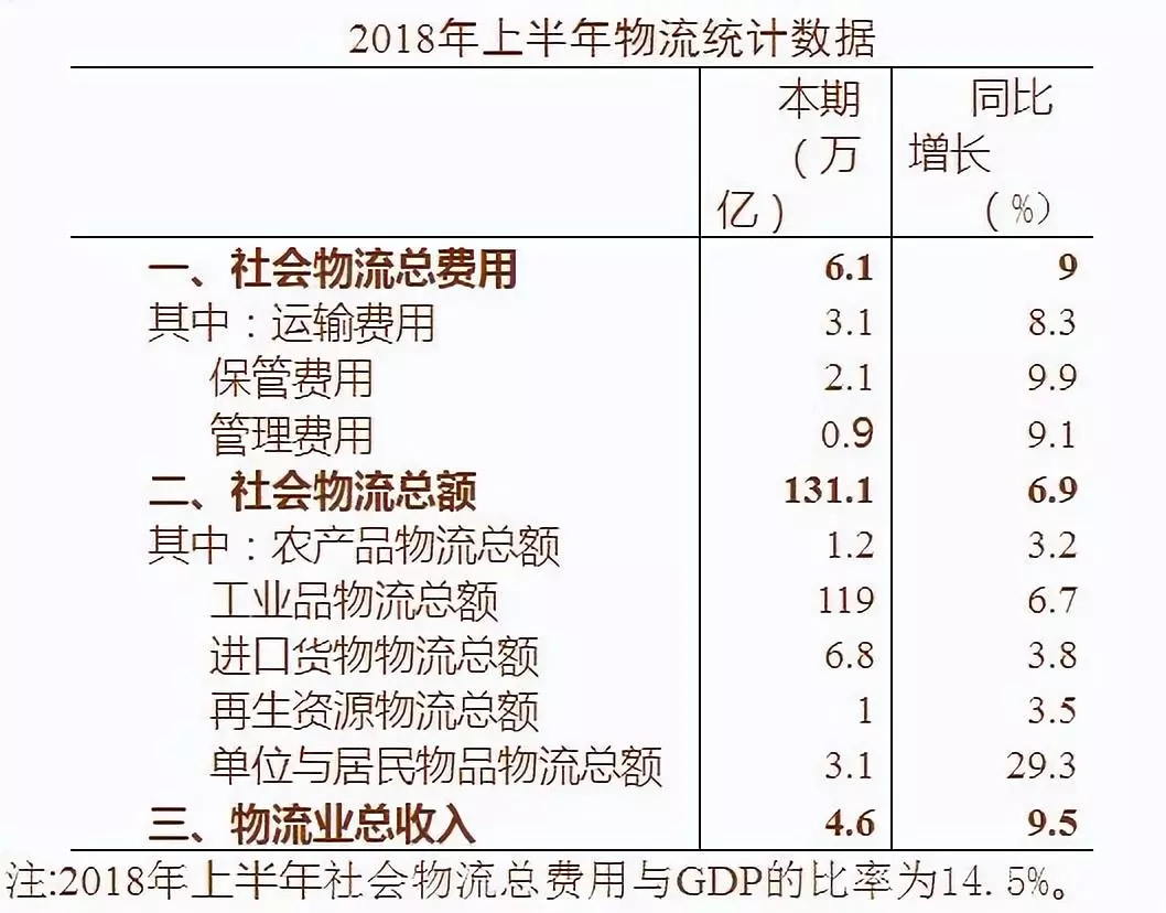 2018年1-6月,社會物流總費(fèi)用為6.1萬億元,同比增長9%,增速比一季度提高2個百分點(diǎn);物流市場規(guī)模穩(wěn)步增長,物流業(yè)總收入為4.6萬億元,同比增長9.5%,增速比一季度提高1.3個百分點(diǎn)。